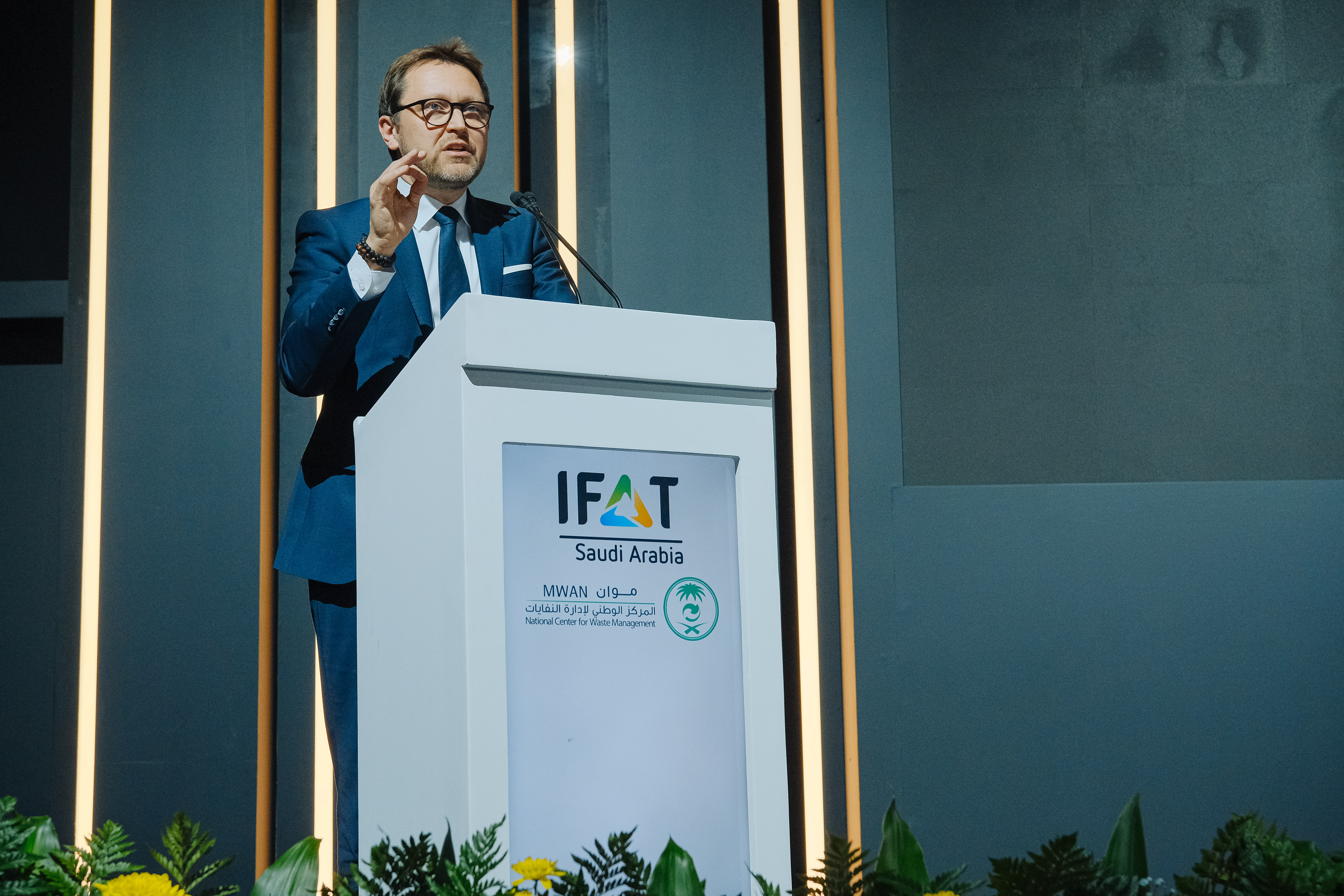 A man wearing glasses and a blue suit stands at a lectern at IFAT Saudi Arabia and speaks to an audience outside the frame.