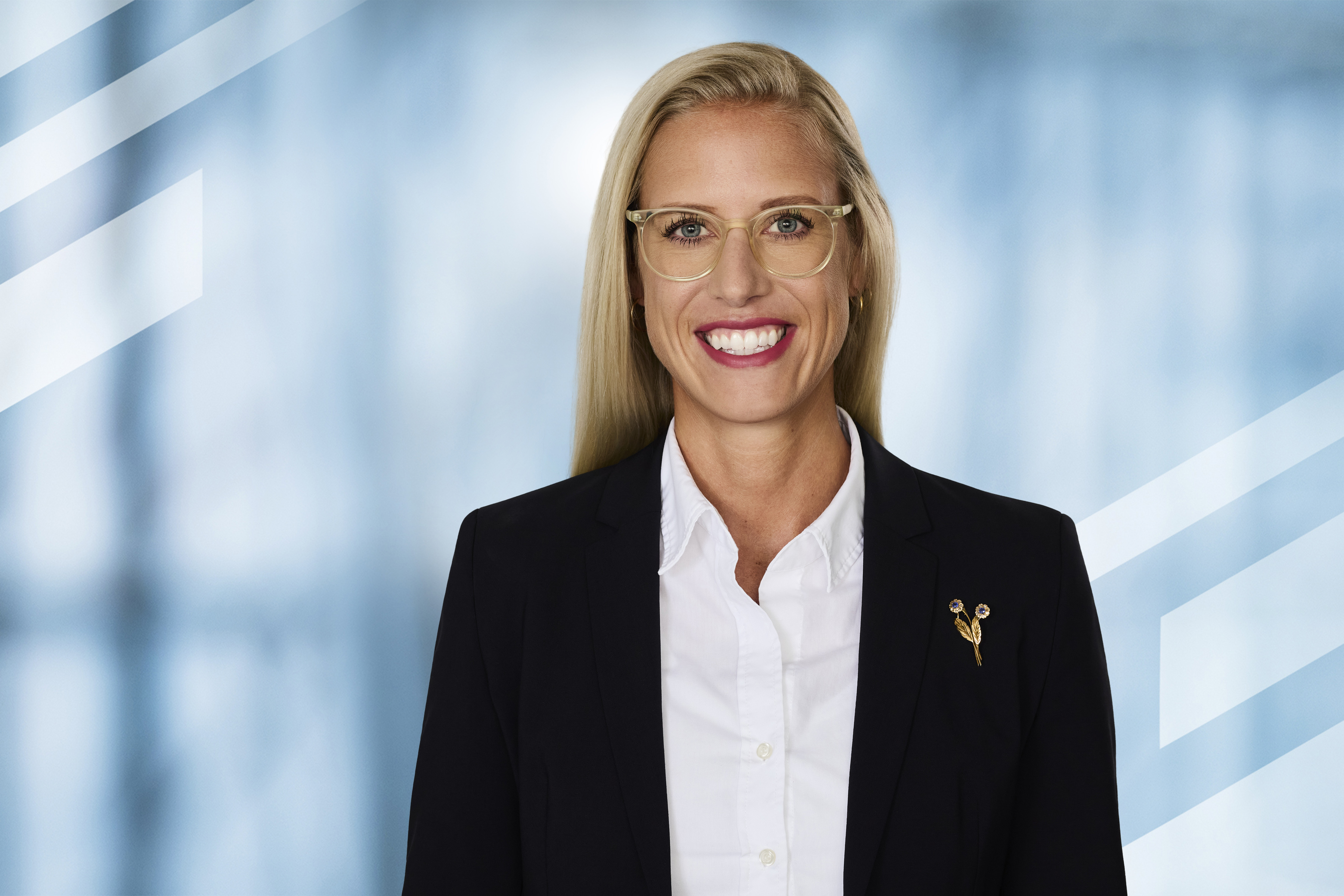 Smiling woman with long blonde hair, glasses, and business attire in front of a blue background.